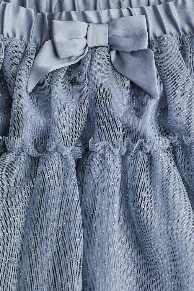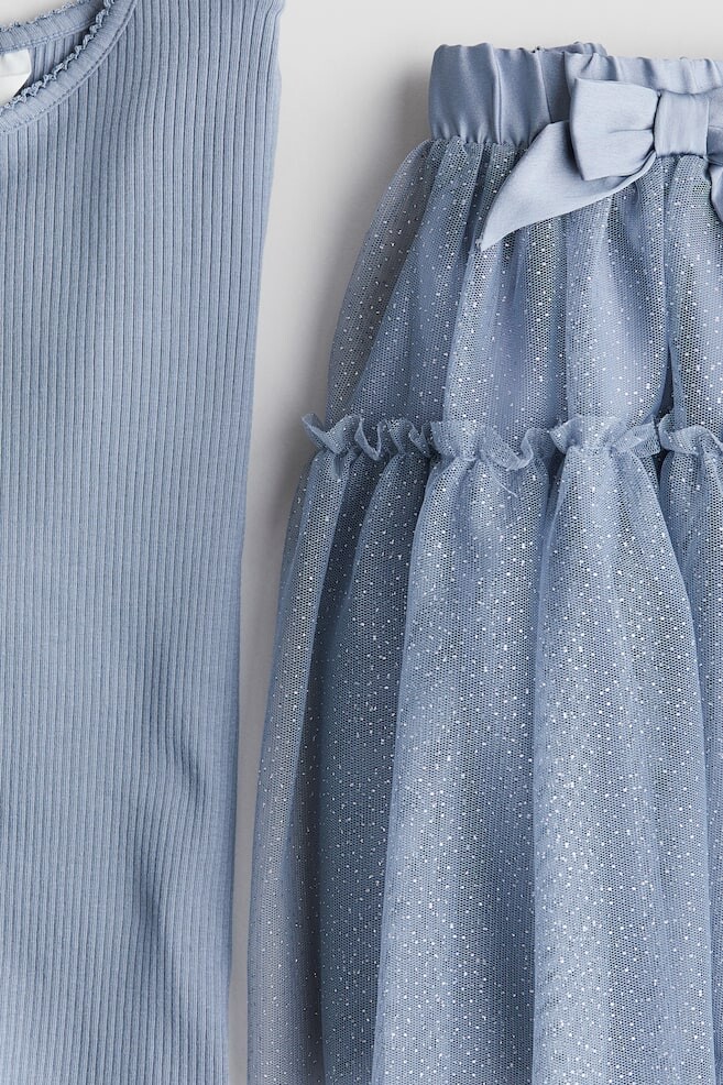 Комплект из двух предметов: рубашка и тюлевая юбка в тон. Рубашка в рубчик с длинными рукавами из мягкого хлопкового трикотажа с отделкой пико на круглом вырезе. Плюс юбка из двухслойного тюля с блестящим принтом по всей поверхности и эластичным поясом с аппликацией спереди. Присборенный разделительный шов с воланами обеспечивает дополнительный объем. На подкладке. Количество штук/пар: 2 Длина: До колена Длина рукава: Длинный рукав Посадка: Классический крой Фильм: Круглый вырез Вырез: Круглый вырез
