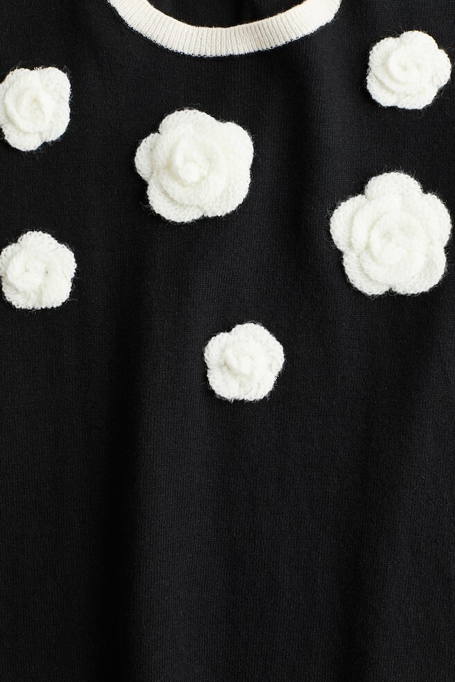 Платье А-силуэта из мягкого тонкого хлопкового трикотажа с аппликациями спереди. Круглый вырез горловины с ребристой отделкой, заниженная линия плеча и короткие рукава-буфы.