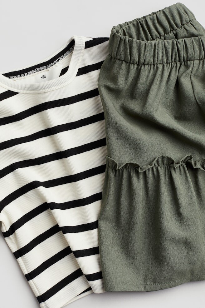 Комплект из рубашки из хлопкового трикотажа в рубчик и тканой юбки в тон. Рубашка с короткими рукавами и круглым ребристым вырезом. Юбка с прикрытым эластичным поясом и оборками для дополнительной ширины. Без подкладки.