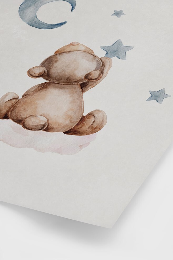 Милый постер с изображением плюшевого мишки, сидящего на облаке и собирающего звезды с неба. Эта красивая акварельная иллюстрация создает ощущение мягкости и уюта в детской комнате! Прекрасно сочетается с постером «Спящий Тедди», выполненным в той же цветовой палитре.