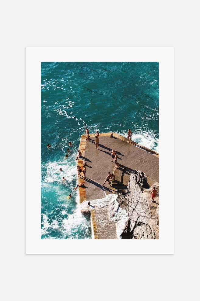 Фотография выступающего в море причала с купающимися людьми. Мотив имеет встроенное белое крепление.
