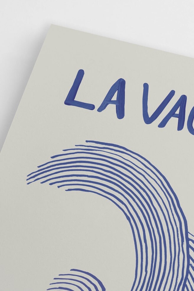На бежевом фоне расположен нарисованный вручную мотив, изображающий синие линии, образующие волну. Над волной написано слово на французском языке. Мотив является частью Ателье No. Коллекция 03, созданная нашими штатными дизайнерами для Postery Atelier.