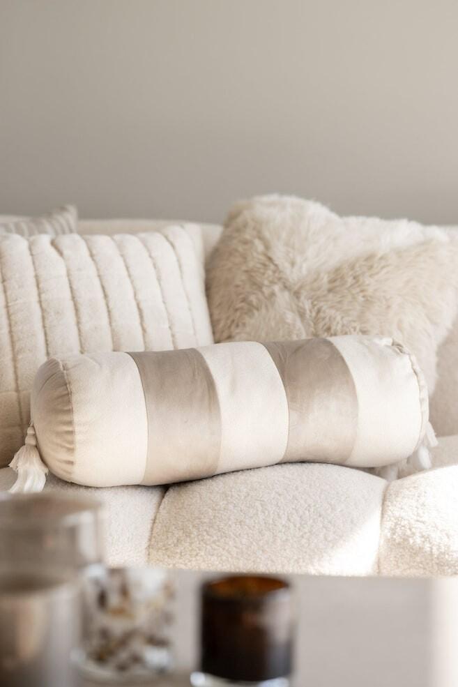 Подушка из бархата и жаккардовой ткани, с кисточками по бокам. Размеры 18 х 18 х 45 см, благодаря размеру и форме его можно прекрасно использовать как декоративное постельное белье или как дополнительную подушку на диване. Изделие сертифицировано STANDARD 100 OEKO-TEX. Сертификация гарантирует, что продукт прошел испытания и не содержит веществ, которые могут оказать вредное воздействие на здоровье и окружающую среду. Вес: 450 г Категория номера: Гостиная Описание: Кремово-белый, в полоску.