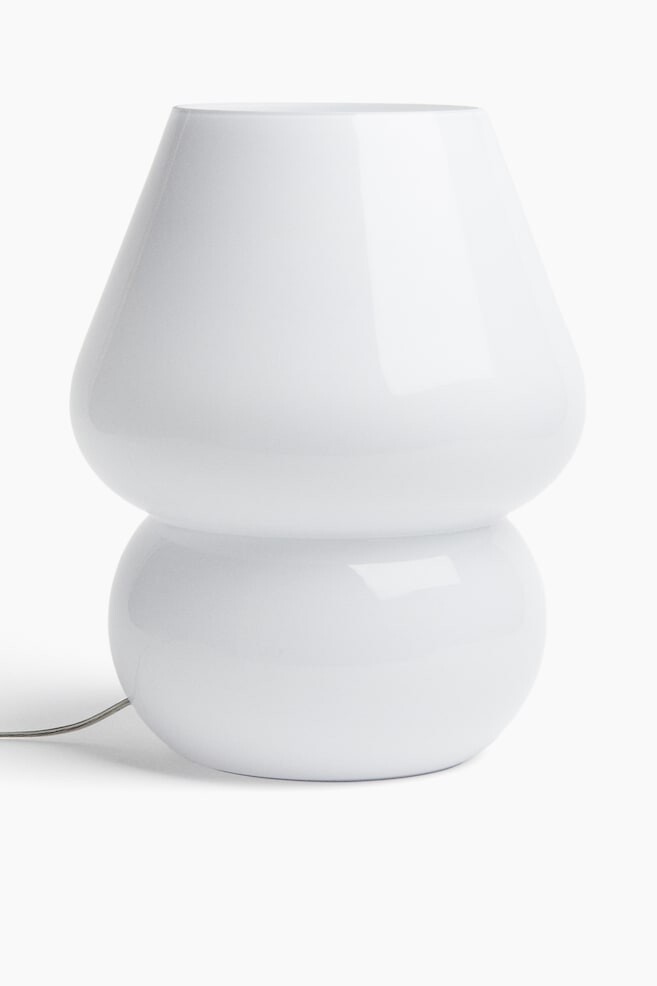 Большая настольная лампа из цветного стекла, распространяющая мягкий свет и создающая теплую атмосферу. Кабель с пластиковым переключателем. Патрон лампы Е27. Макс. 15 Вт светодиод. Лампа не входит в комплект. Самое широкое место 28 см. Высота 35 см. Длина кабеля 160 см. Категория помещения: Гостиная Описание: Белый, Однотонный Безопасность продукта: Для этого абажура используйте только светодиодные лампы.