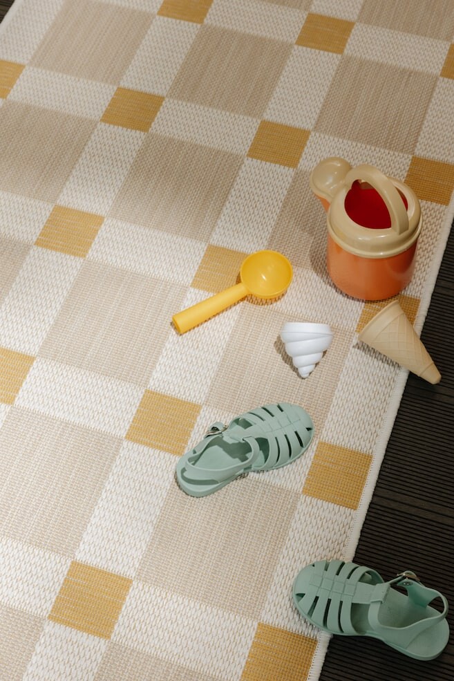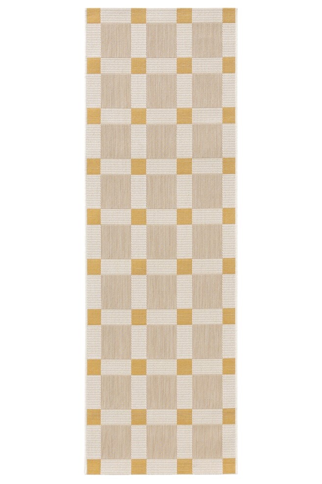Коврик Vega для внутреннего и наружного использования соткан машинным способом из 100% полиэстера (переработанного ПЭТ). Изделие бренда benuta Nest бежевого/желтого цвета имеет следующую структуру: Геометрическая. Размеры изделия: 70x200 см.