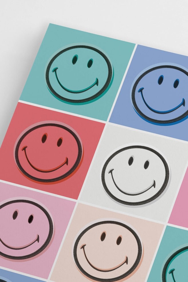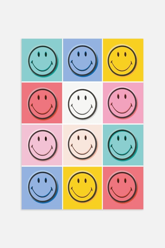 Смайлик х Постер. Оживите комнату с помощью современной интерпретации этого мотива в стиле поп-арт. На плакате изображены двенадцать смайликов в блоках ярких цветов.