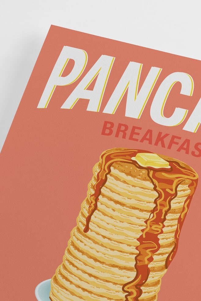 Плакат «Блинный завтрак» — это прекрасно иллюстрированный кухонный принт в стиле ретро с зернистой текстурой, который подчеркнет вашу кухню!