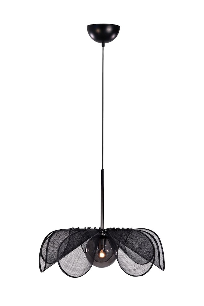 Черный потолочный светильник в форме цветка. Разработано Аней и Филиппой. Абажур из банановых волокон похож на лепестки цветов. Дымчатое стекло создает приятное настроение. Каждый лепесток крепится отдельно с помощью двух черных гаек, которые также являются интересной деталью конструкции. Материал лепестков прозрачный и прочный, по структуре напоминает лен. Детали из черного металла. Черный текстильный кабель и потолочная оболочка из матового черного металла. Для лампы требуется большая цокольная лампа (E27) мощностью не более 40 Вт или эквивалентная светодиодная лампа (не входит в комплект). Длина кабеля 2 м, потолочная розетка в комплект не входит. Размер светильника: ширина 63 см, глубина 63 см, высота 50 см. Вес: 1,33 кг Категория помещения: Гостиная Описание: Черный