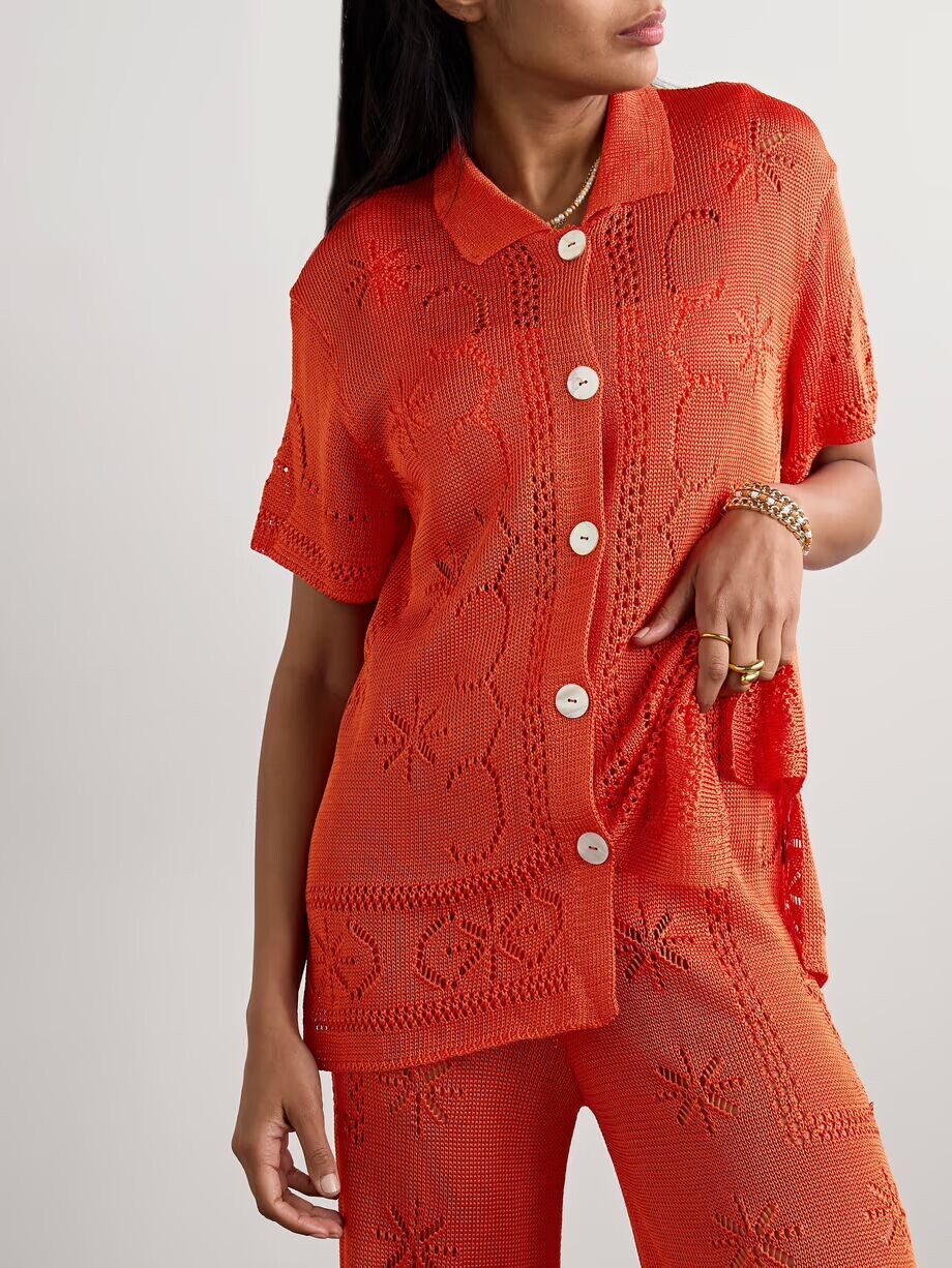 Рубашка Calle Del Mar связана спицами пуантами с пляжным цветочным мотивом, вдохновленным скатертями, принадлежащими семье основателя Азы Зиглер. Созданная по образцу традиционной мужской одежды, она имеет аккуратный остроконечный воротник и блестящие пуговицы. Свободная посадка позволяет легко надевать купальник поверх купальника или майки.