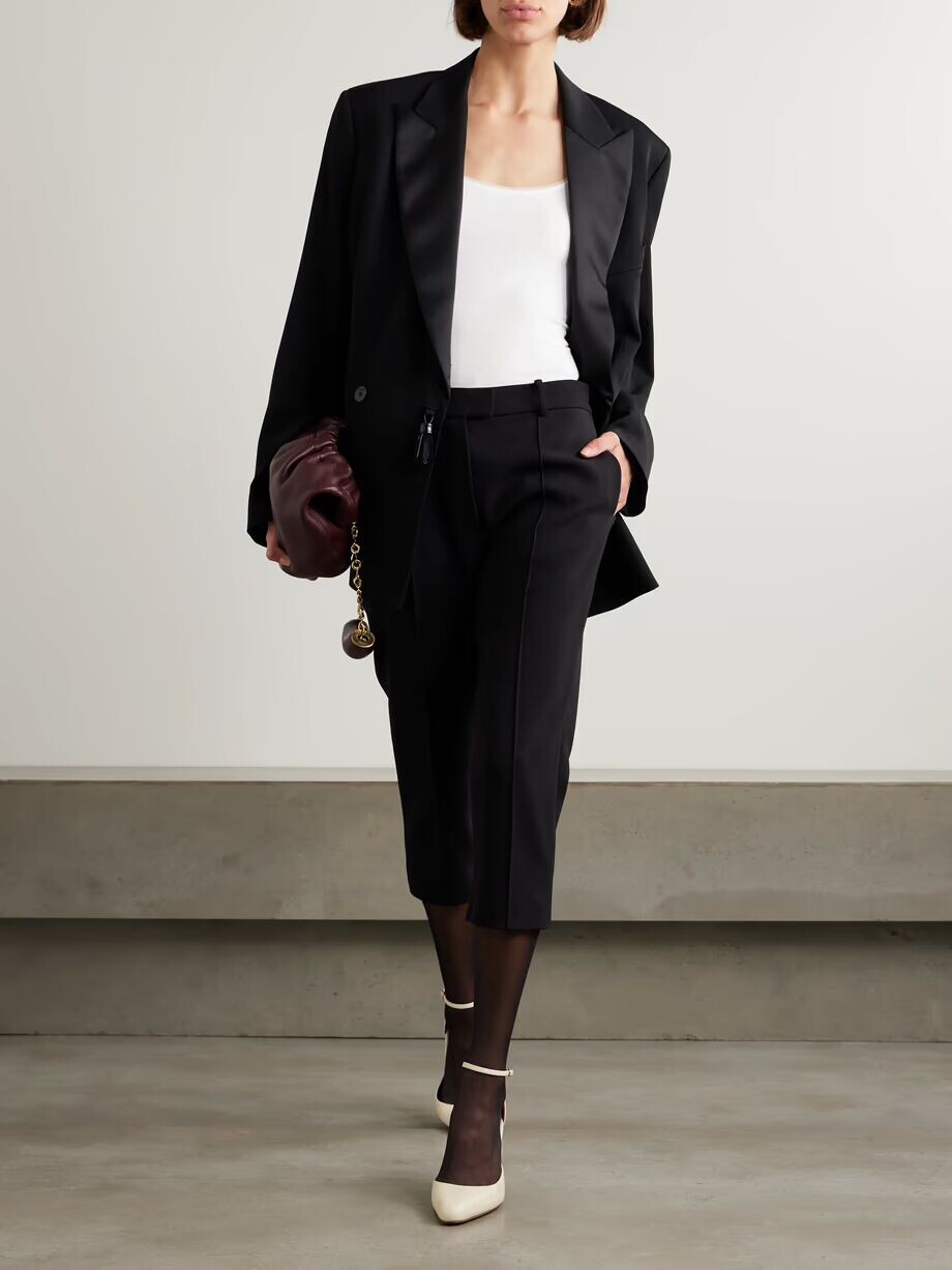 На фото: [Theory Blazer], [Goldsign Jeans], [Сумка через плечо Loewe], [Jacquemus Mules], [Ожерелье Alighieri.], [Серьги Алигьери], [Чокер Чан Луу].
