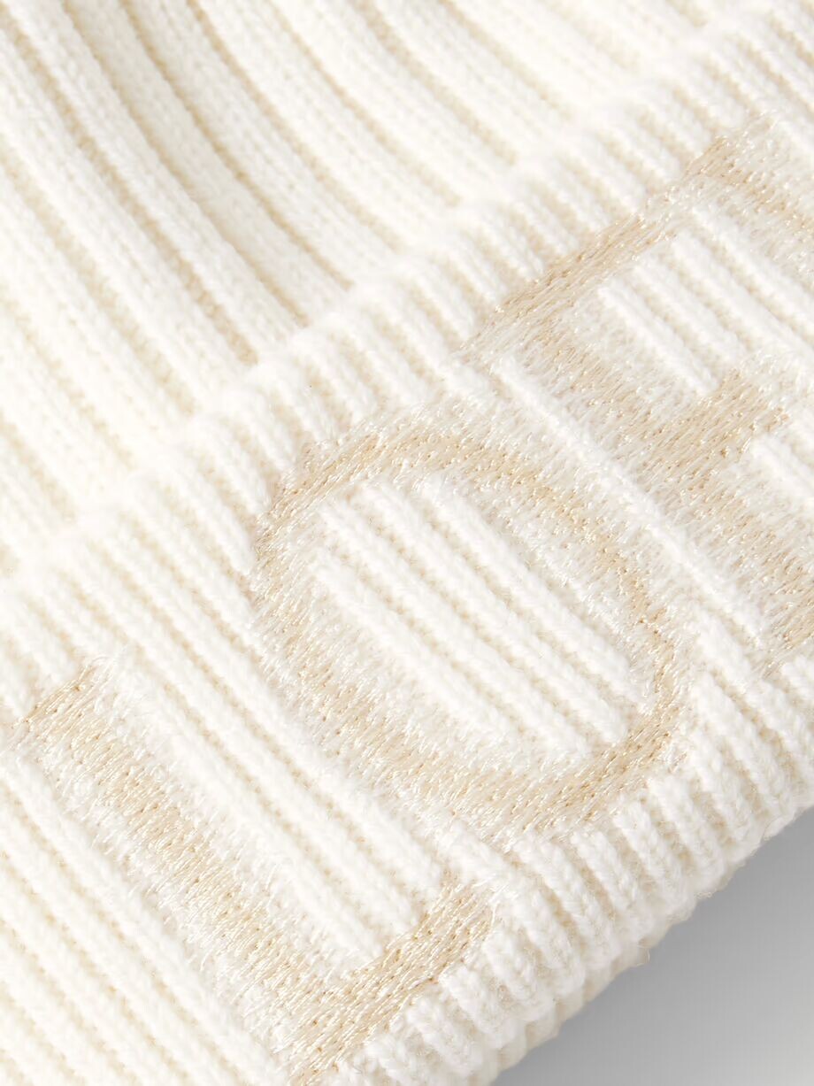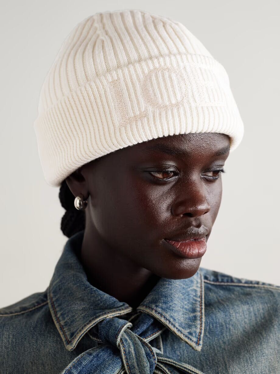 Шапка Loewe вышита «размытым» логотипом дома — тоновые нити делают ее еще более загадочной. Он связан из шерсти с ребристыми краями для тепла и гибкости.