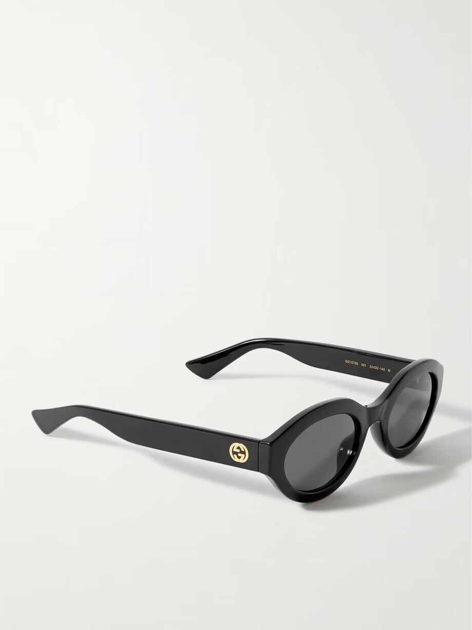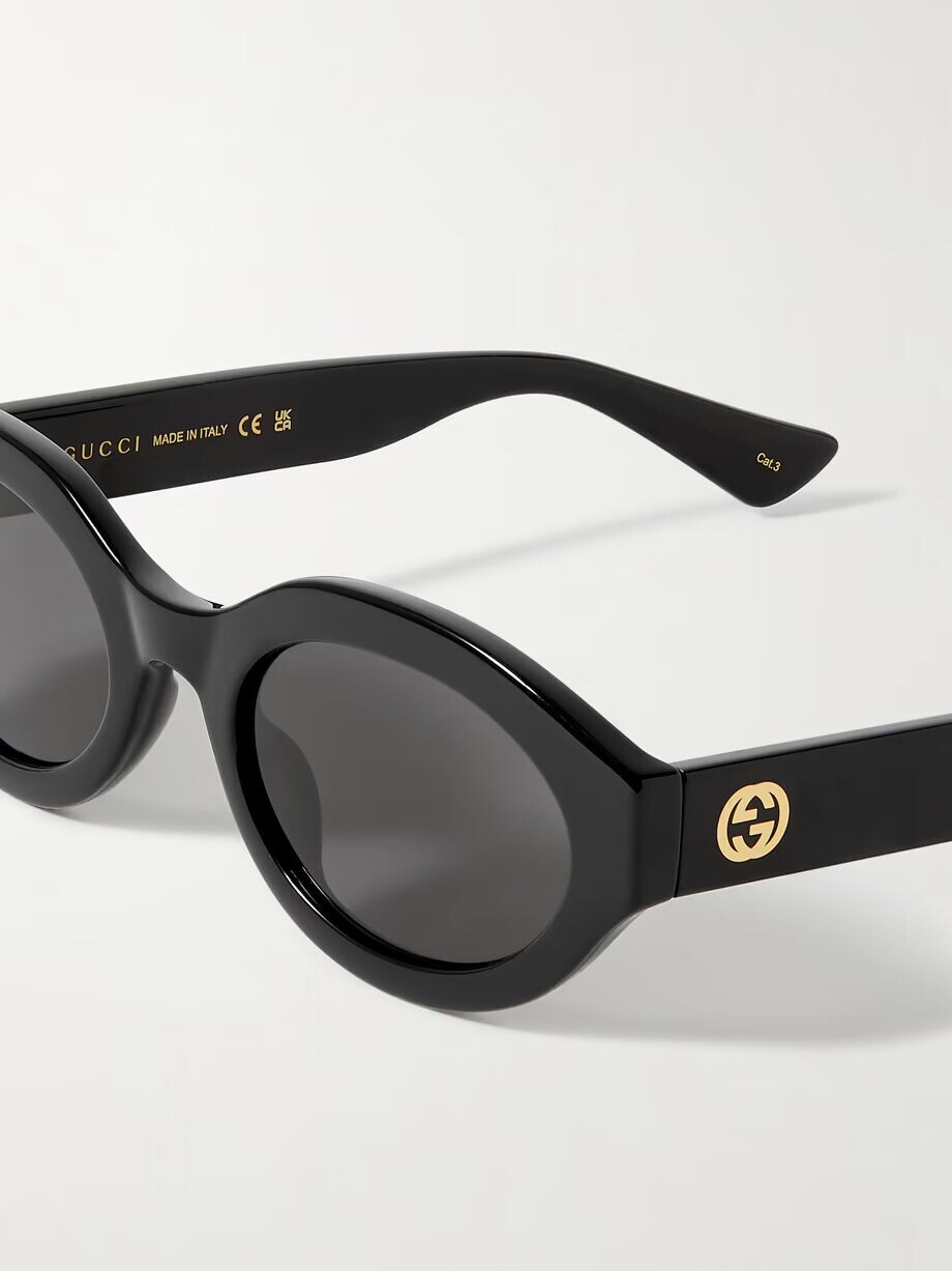 Солнцезащитные очки Gucci Eyewear имеют шикарный минималистичный дизайн, поэтому они подойдут практически к любому наряду. Эта пара в овальной оправе изготовлена ​​в Италии из глянцевого ацетата и украшена золотым логотипом GG на дужках.