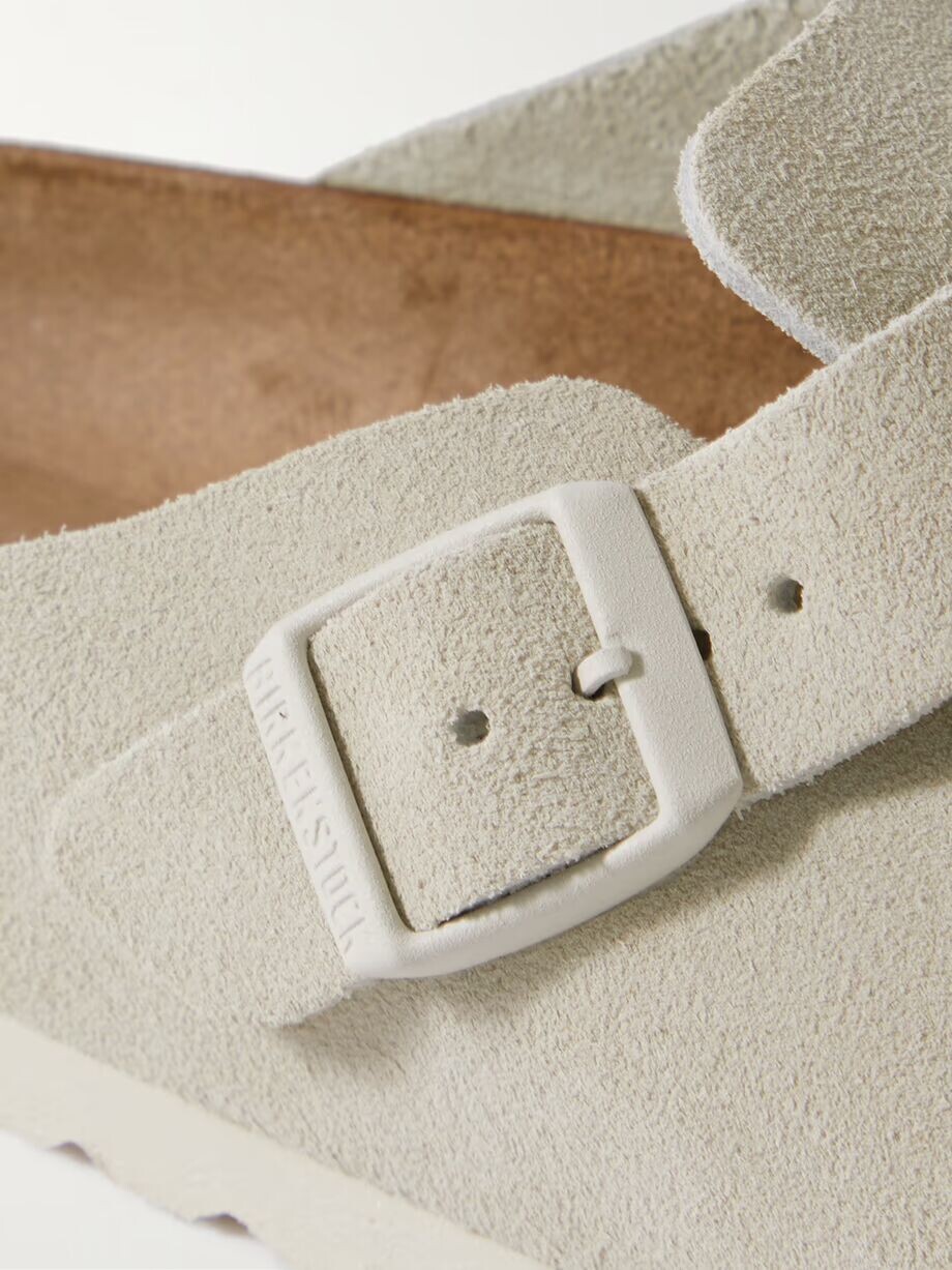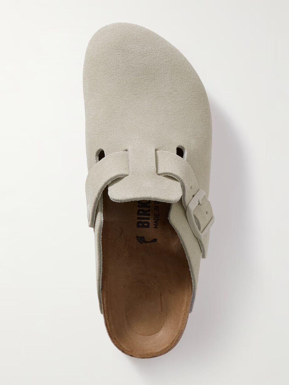 Дебютировавшие в 1977 году культовые сабо «Бостон» от Birkenstock до сих пор высоко ценятся за свой комфорт и легкость. Эта пара изготовлена ​​в Германии из замши и оснащена эргономичной пробковой подошвой, которая со временем приспосабливается к форме вашей ноги. Сбоку у них также фирменный ремешок с пряжкой.