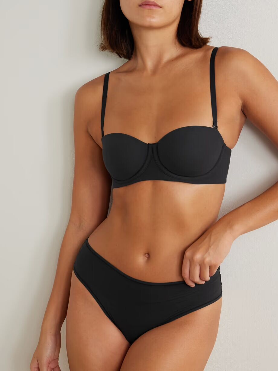 Бюстгальтер без бретелек SKIMS, входящий в коллекцию «Подходит всем», изготовлен из очень мягкой эластичной ткани, идеально прилегающей к коже. Он обеспечивает поддержку с помощью мягкой мягкой косточки, которая не впивается в кожу, и имеет силиконовую ленту вдоль выреза и по бокам, чтобы удерживать ее на месте. Дополнительные ремни можно носить несколькими способами.