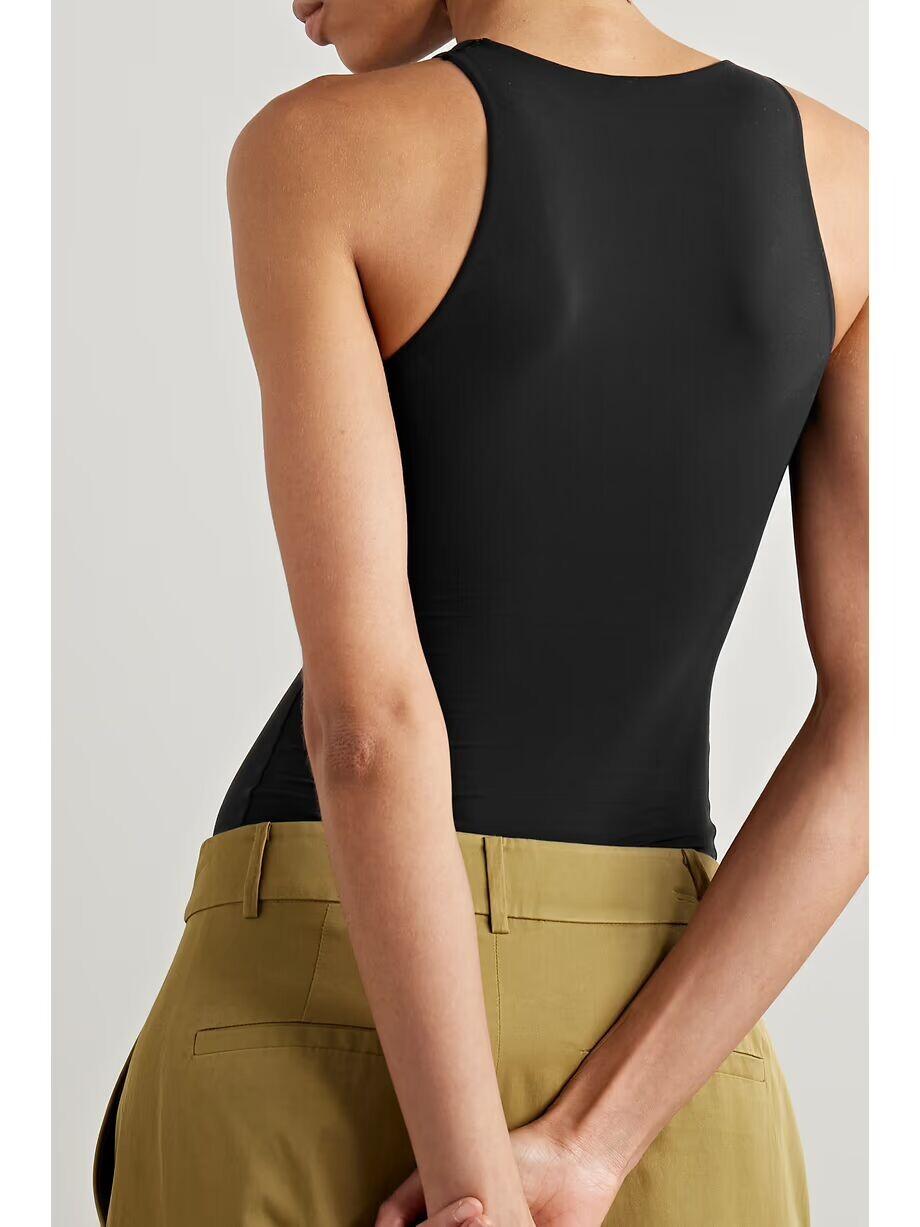 Боди SKIMS «Подходит всем» заслужило культовый статус благодаря тому, как оно облегает и моделирует фигуру. Он изготовлен из двухслойной гладкой ткани, хорошо тянущейся, и имеет бесшовные вставки на спине, которые кажутся невидимыми под одеждой.