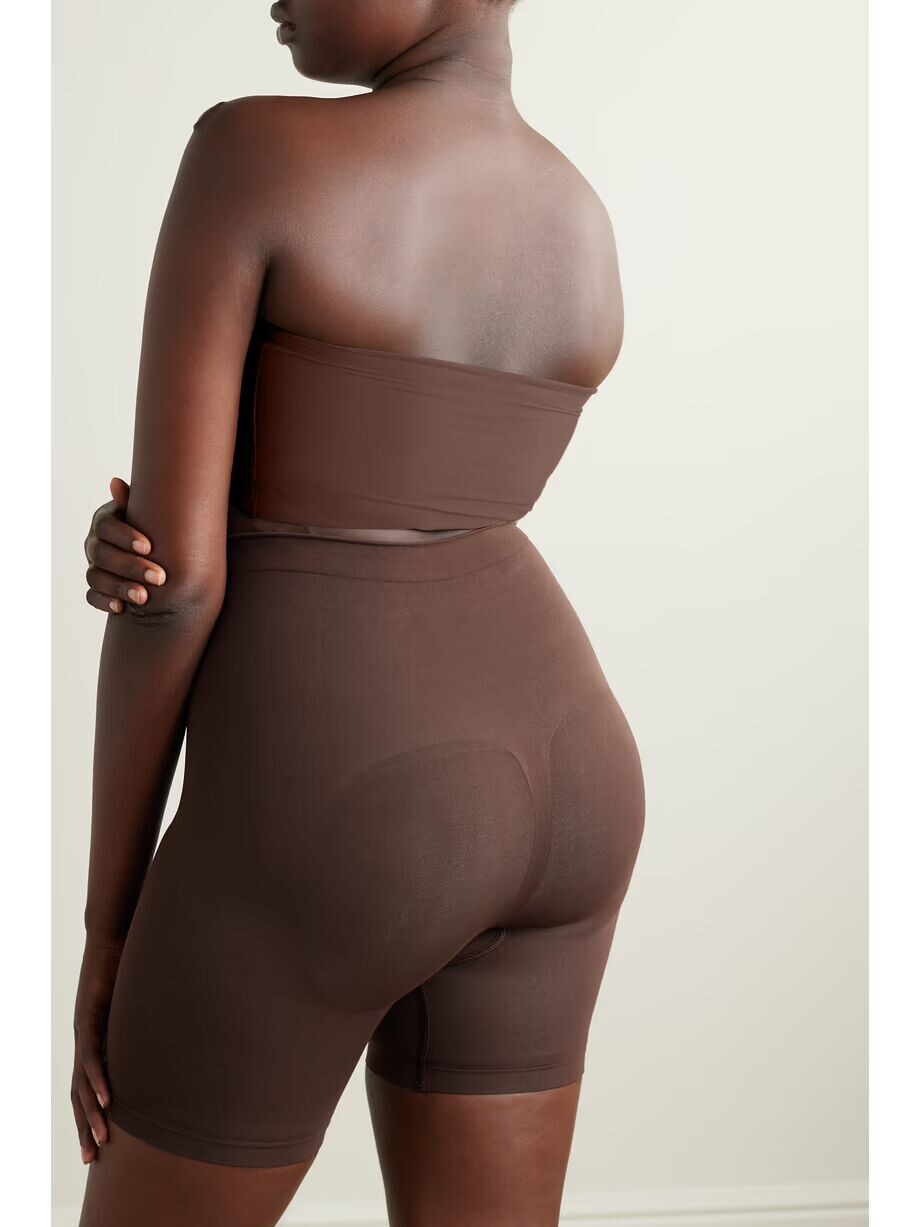 Коллекция SKIMS «Seamless Sculpt» популярна не зря: эластичная ткань обеспечивает сильный, целенаправленный контроль и сжатие, но при этом обеспечивает комфорт. Они на 41 % состоят из переработанных волокон, дополнены силиконовой нижней лентой, предотвращающей скатывание, и имеют открытую ластовицу.