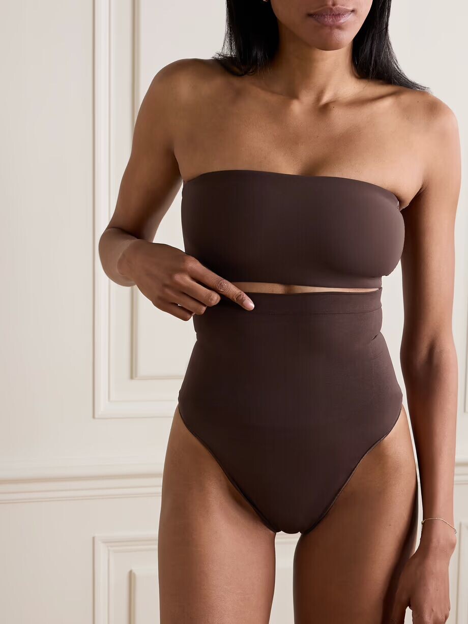 Стринги SKIMS, входящие в линию «Seamless Sculpt», изготовлены из эластичной ткани, обеспечивающей «сильный» уровень поддержки бренда. Он имеет высокую талию, доходящую чуть ниже груди, и внутреннюю силиконовую полоску, удерживающую ее на месте.