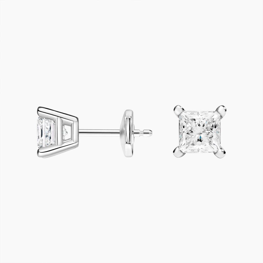 Эти прекрасные серьги украшены парой бриллиантов огранки «принцесса», закрепленных в классической корзинчатой оправе с надежными защитными штифтами.