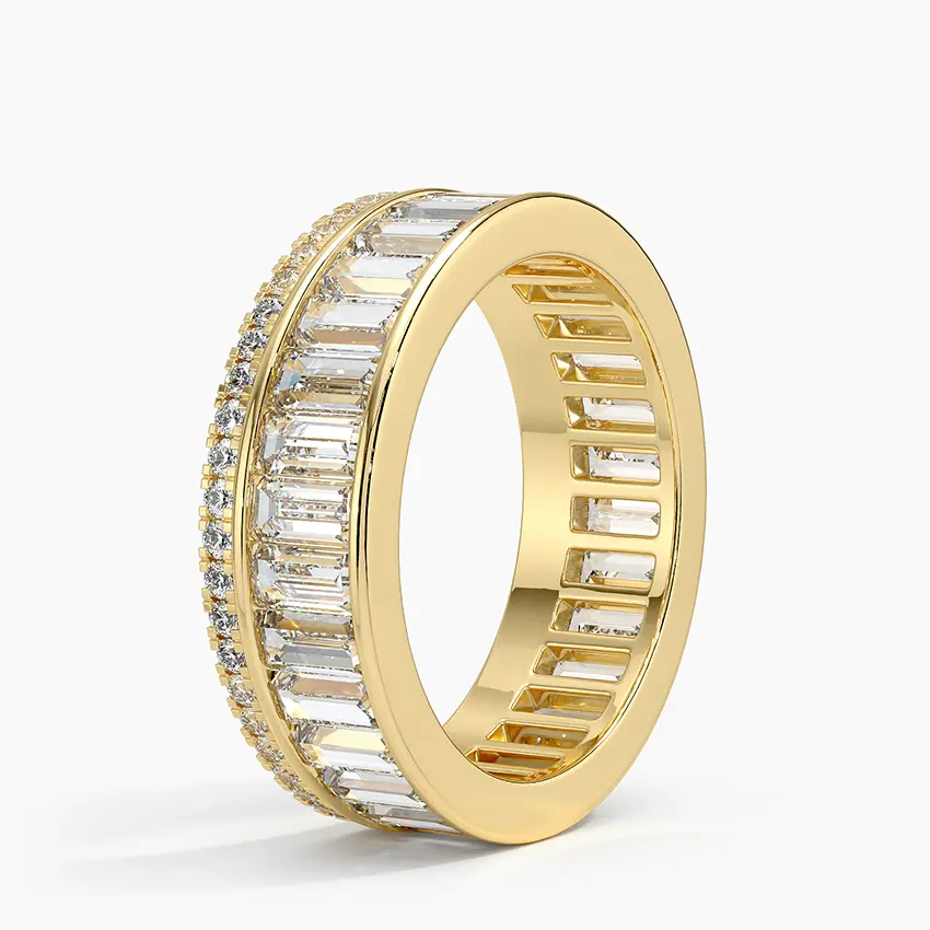 Это кольцо украшено рядом лабораторных бриллиантов багетной огранки, увенчанных рядом круглых лабораторных бриллиантов, что придает ему сверкающий, привлекающий внимание вид (общий вес 2 2/3 карата).