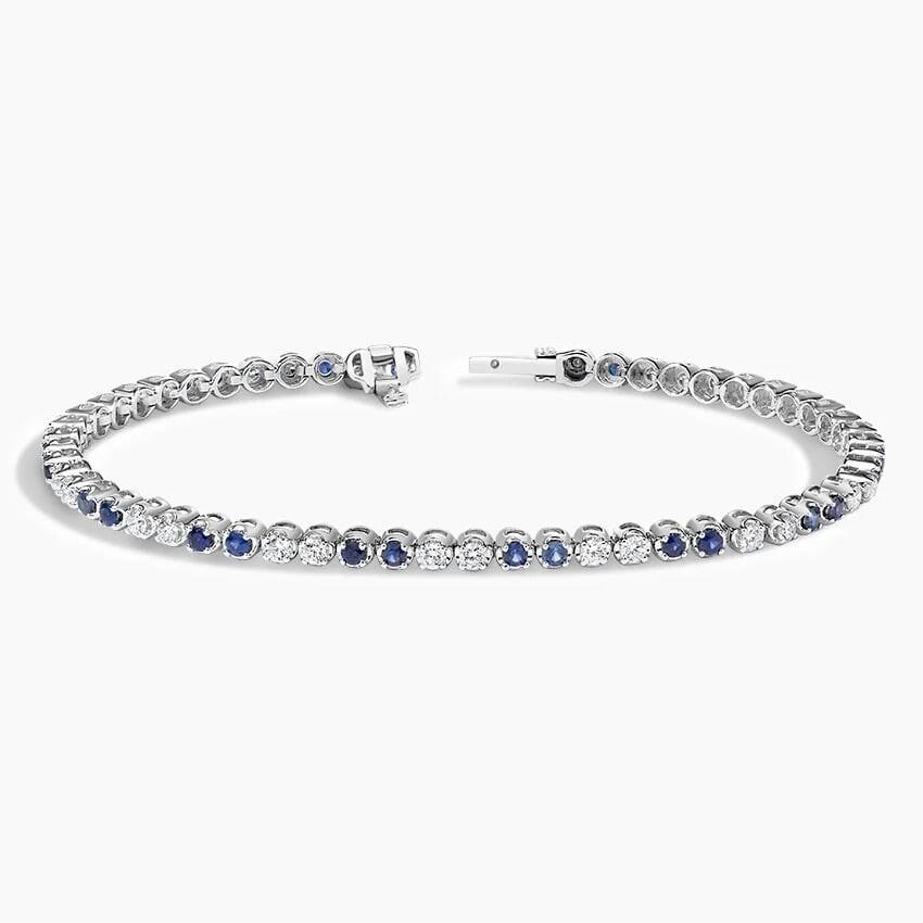 Этот классический теннисный браслет украшен чередующимися дуэтами синих сапфиров и сверкающих бриллиантов, которые окутывают запястье аурой света (общий вес бриллиантов — 1 карат).