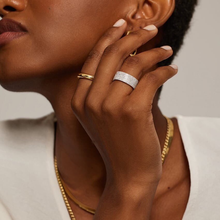 Семь рядов мерцающих лабораторных бриллиантов, охватывающих весь ободок, окутывают палец светом в этом гламурном коктейльном дизайне (общий вес 1 1/2 карата).
