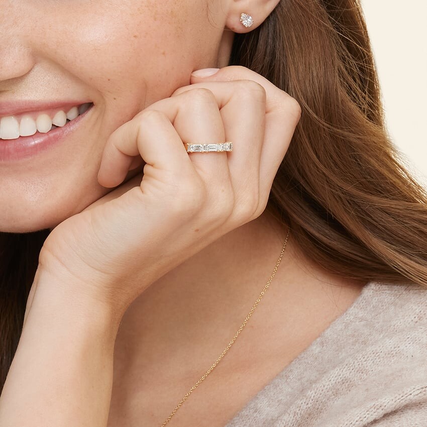 В этом гламурном и элегантном обруче сверкающие лабораторные бриллианты багетной огранки расположены вертикально между горизонтально расположенными лабораторными бриллиантами изумрудной огранки.