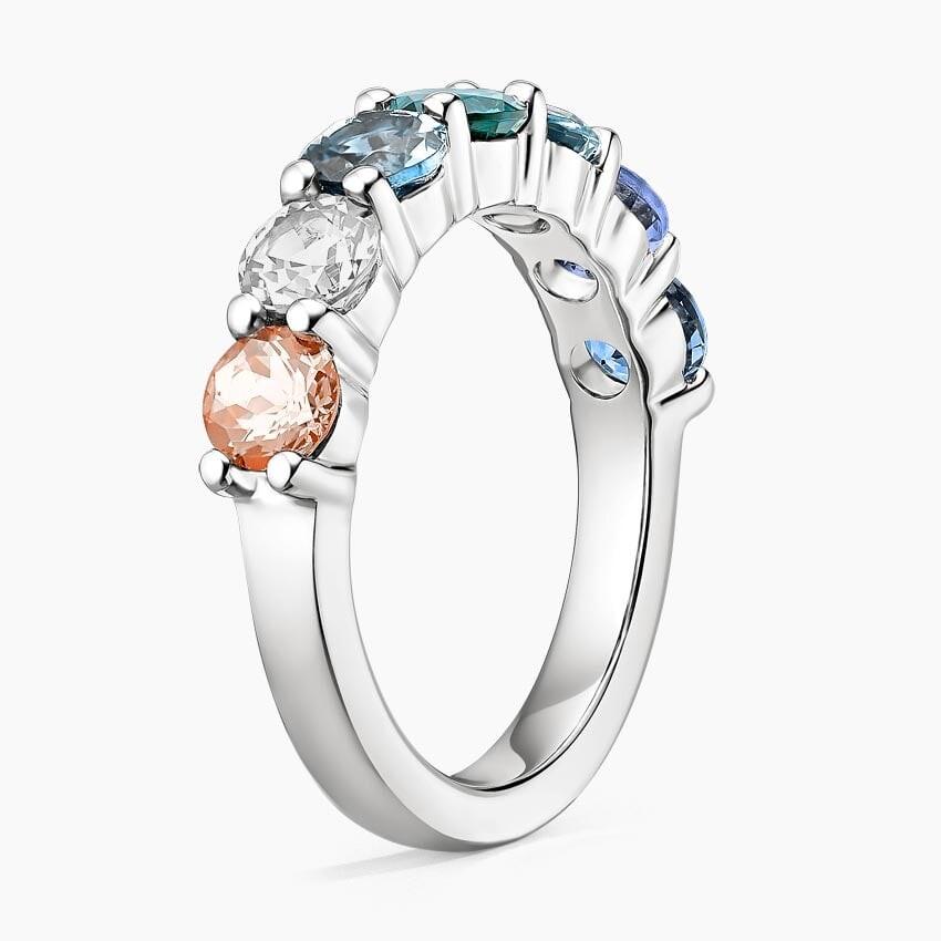 Мерцающие лабораторные сапфиры, лабораторные шпинели, топазы и лабораторные александриты создают привлекательный эффект омбре, который охватывает половину этого шикарного, причудливого кольца.