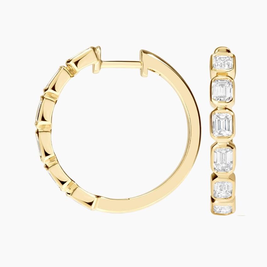 В этих современных, но в то же время классических серьгах-кольцах (общий вес 1 1/5 карата) лабораторные бриллианты изумрудной огранки помещены в блестящие безельные оправы.