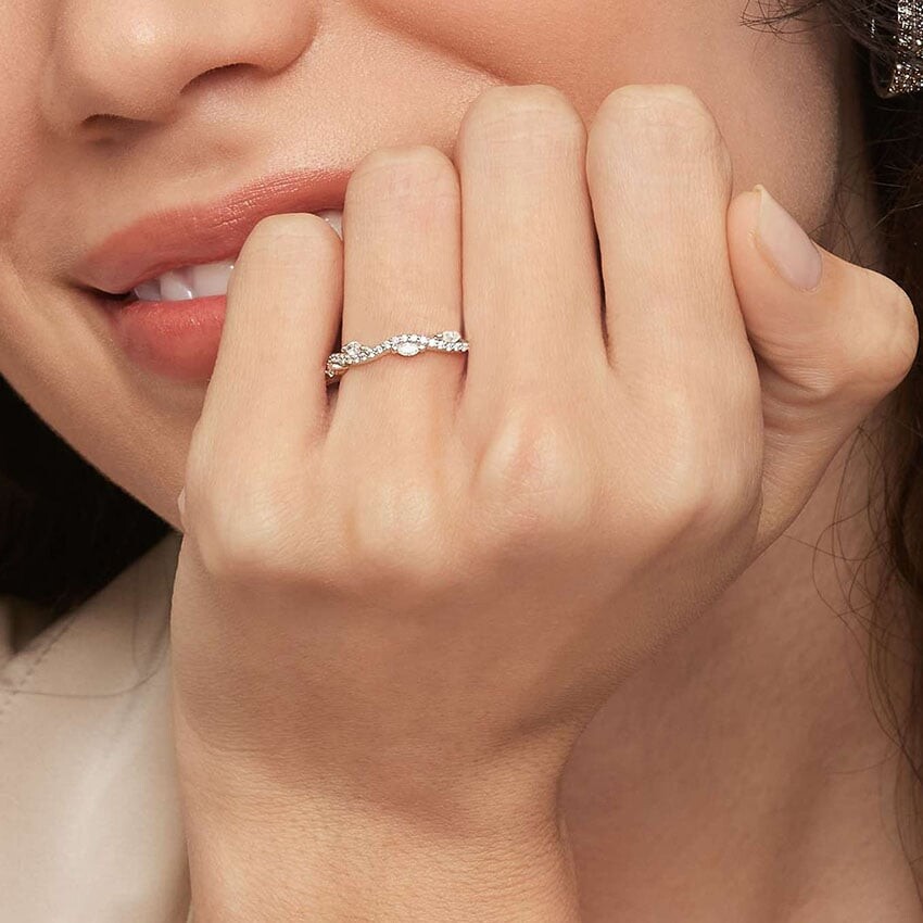 В этом элегантном кольце, вдохновленном природой, лоза из мерцающих бриллиантов нежно обвивает сверкающие листья из бриллиантов огранки «маркиз».