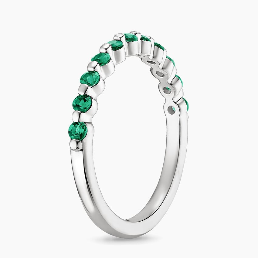 Плавающие общие лабораторные изумруды мерцают в верхней половине этого нежного и красочного обручального кольца, создавая эффектный образ.