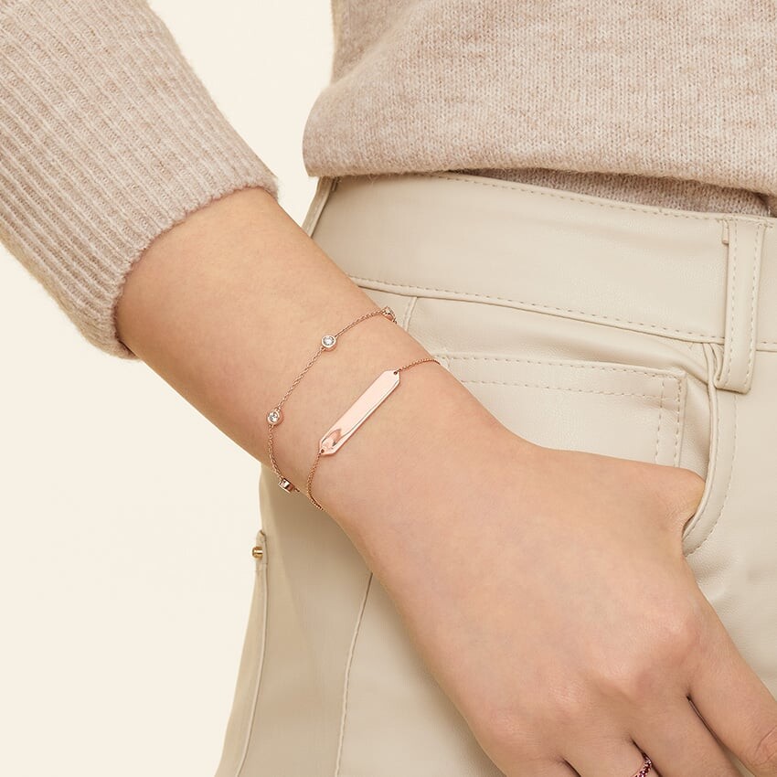 Этот элегантный и неподвластный времени браслет украшен пятью сверкающими бриллиантами в оправе на изящной цепочке из тросов. Длина браслета может быть отрегулирована до 6, 6,5 или 7 дюймов в соответствии с индивидуальными предпочтениями.