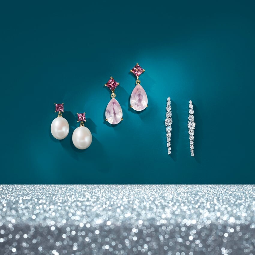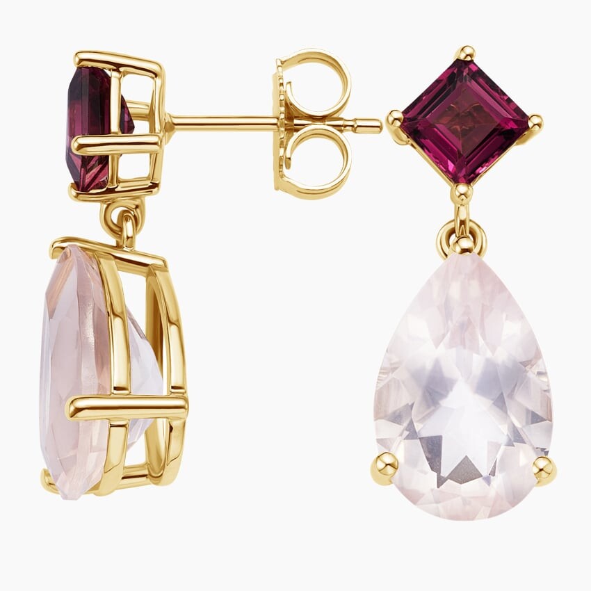 Розовый турмалин огранки «принцесса» покоится на завораживающем розовом кварце грушевидной формы, создавая романтичный, но в то же время элегантный образ в розовых тонах.