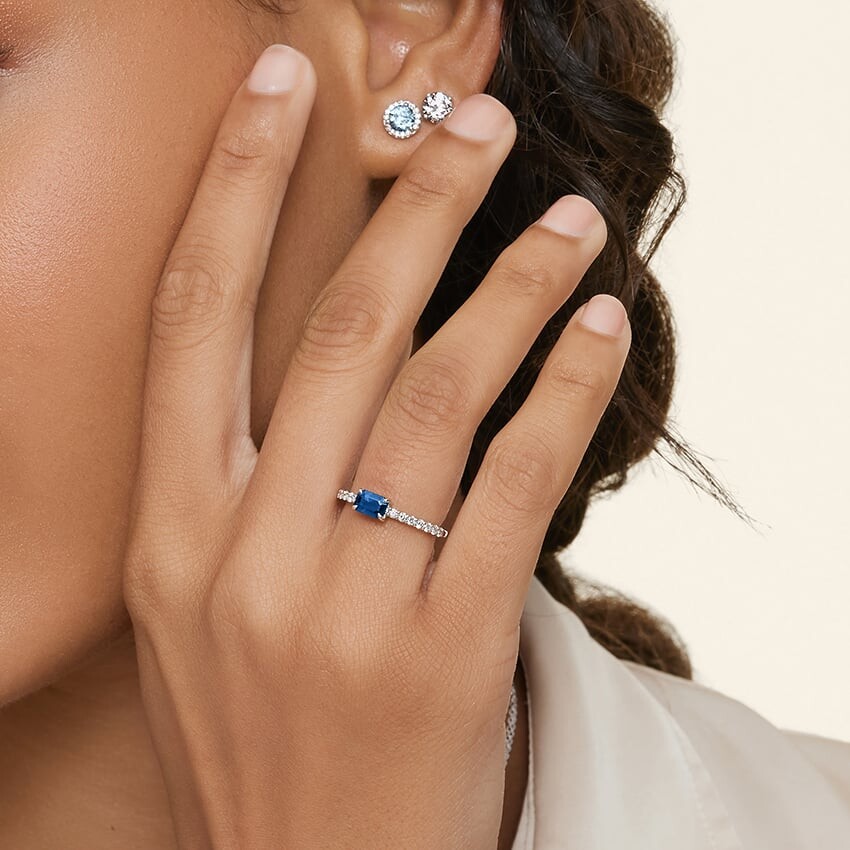 В центре этого кольца, инкрустированного бриллиантами, сверкает сапфир изумрудной огранки (общий вес бриллианта составляет 1/4 карата).