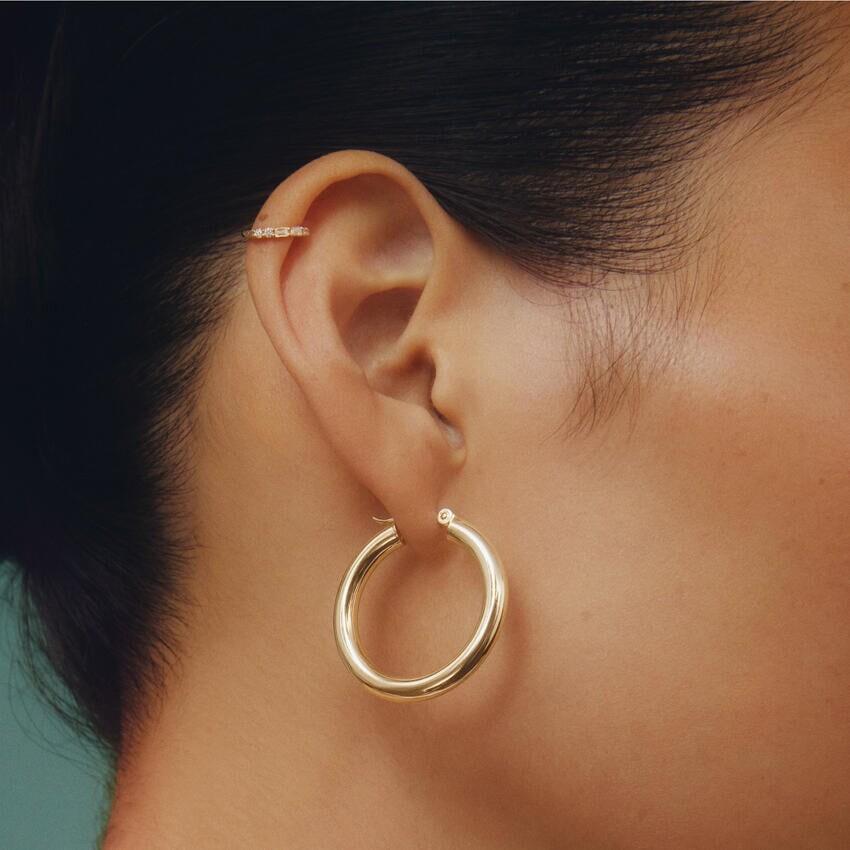 Эти модные серьги-кольца украшены яркими бриллиантами багетной и круглой огранки, что придает им особый, привлекающий внимание вид (общий вес 1/8 карата).