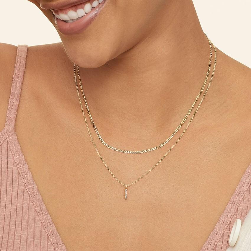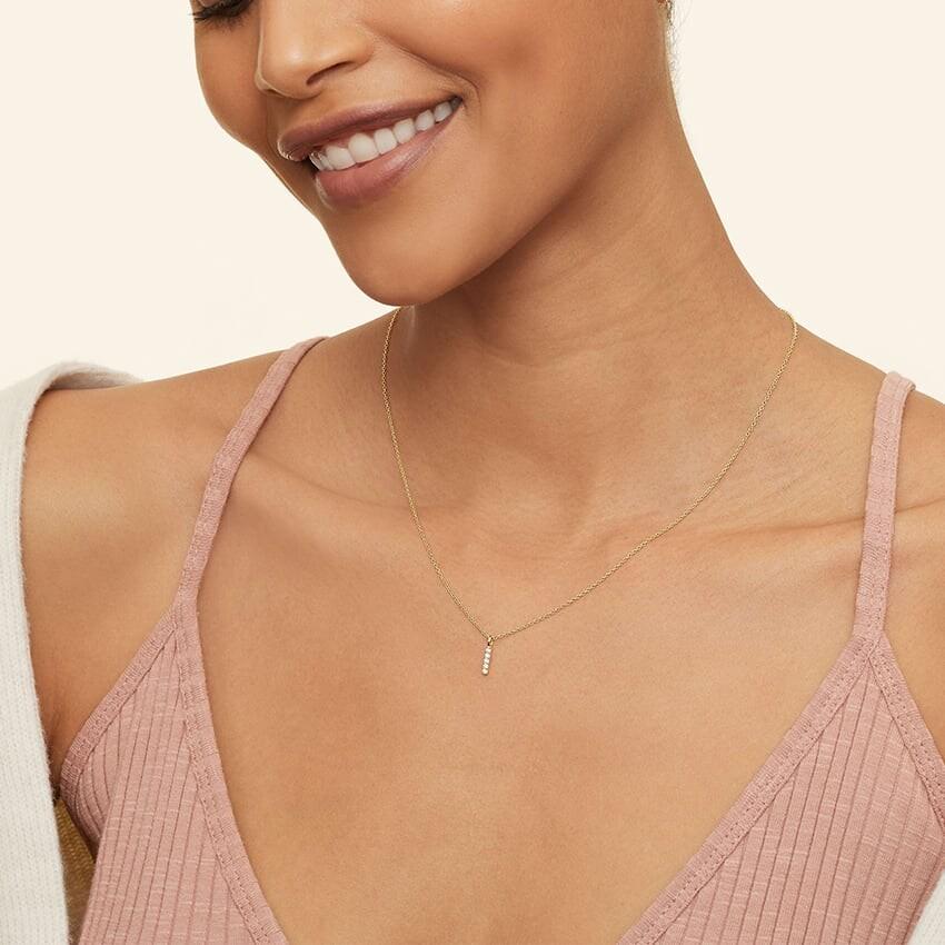 Нежная золотая вертикальная полоса украшена бриллиантами паве, создавая красивое простое ожерелье, которое идеально подходит для повседневного ношения. Длина цепочки может быть отрегулирована до 16 или 18 дюймов в соответствии с индивидуальными предпочтениями (1/15 общего веса карата).