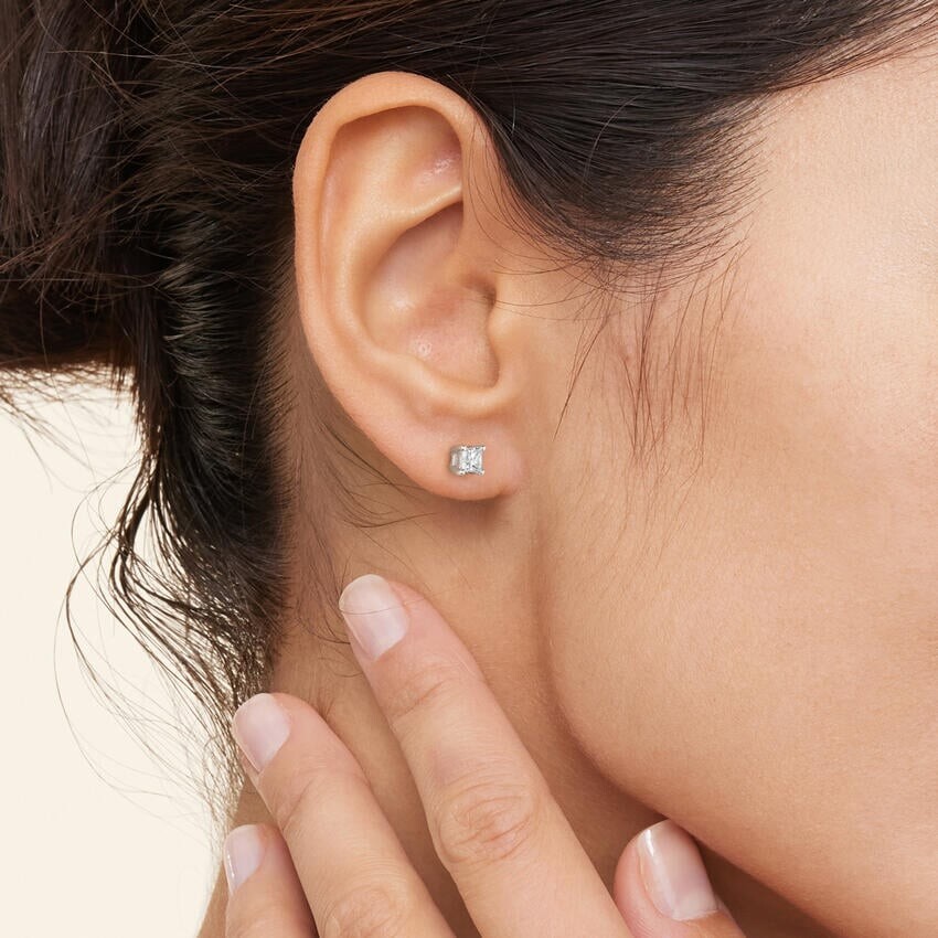 Эти прекрасные серьги украшены парой выращенных в лаборатории бриллиантов огранки «принцесса», закрепленных в классической корзинчатой оправе с выдвижными штифтами.