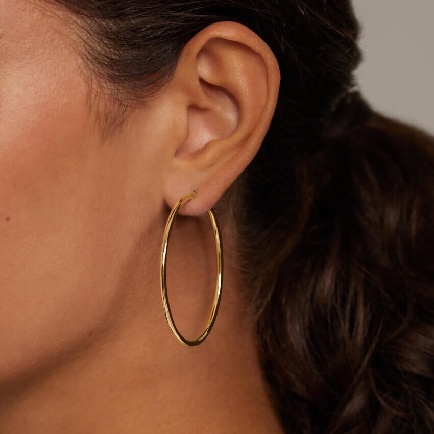 Наш любимый стиль «наряд-или-повседневный». Эти серьги-кольца-трубки настолько легкие, насколько это возможно, идеально подходят для повседневной носки и легко надеваются друг на друга. Большие: 47 мм в высоту, 2 мм в ширину.