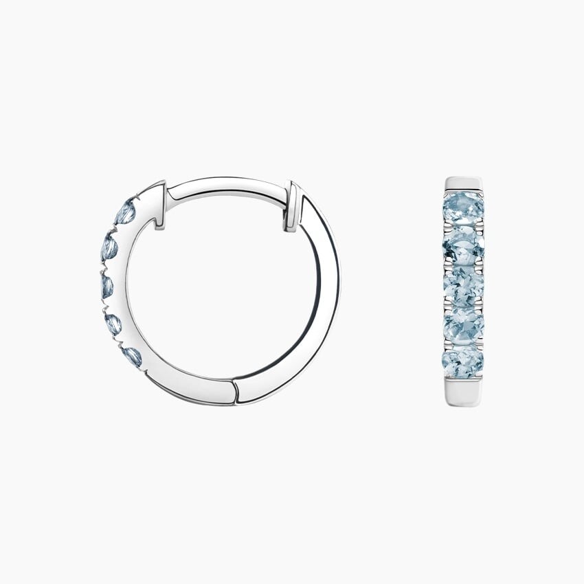 Эти серьги-кольца Huggie Hoop, изысканные и в то же время стильные, украшены сверкающими аквамаринами в фестончатой оправе, образующими изумительно шикарный ряд светло-голубого цвета.
