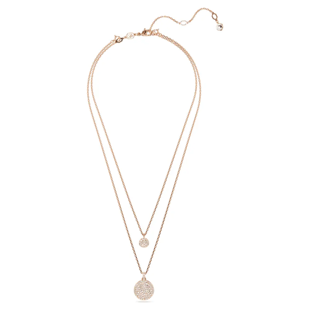 Этот мерцающий многослойный кулон — идеальный способ наполнить ваш стиль светом. Покрытый розовым золотом дизайн включает две цепи, каждая с куполообразным мотивом метеора, который красиво украшен снежным паве из прозрачных круглых кристаллов разных размеров. Для дополнительной универсальности кулон можно перевернуть, открыв нимб из кристаллов вокруг большего мотива и один кристалл в центре меньшего мотива. Чудесный подарок для себя или любимого человека.