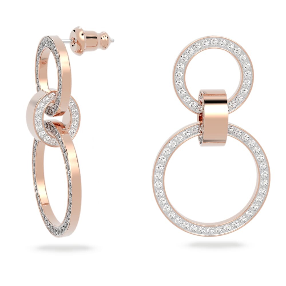 Смелые и вдохновляющие, эти серьги-люстры приковывают взгляды. Переплетенные розово-золотые круги украшены мерцающим кристальным паве в подвиге кропотливого мастерства, которое украсит любой образ.