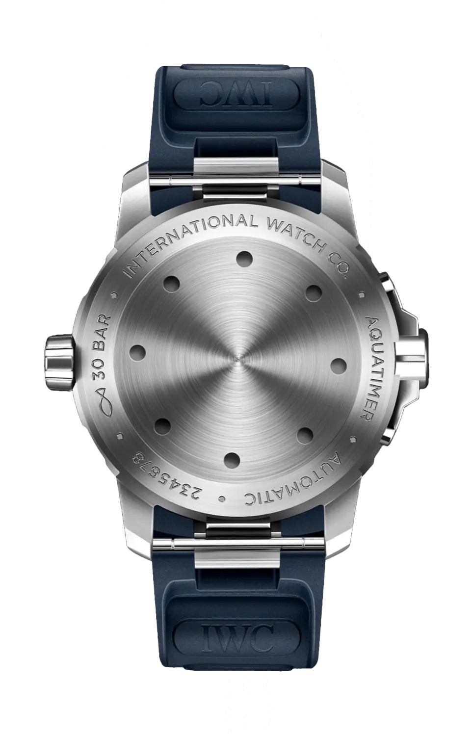 Этот автоматический акватаймер оснащен калибром 32111 производства IWC и имеет стальной корпус, синий циферблат и синий каучуковый ремешок.