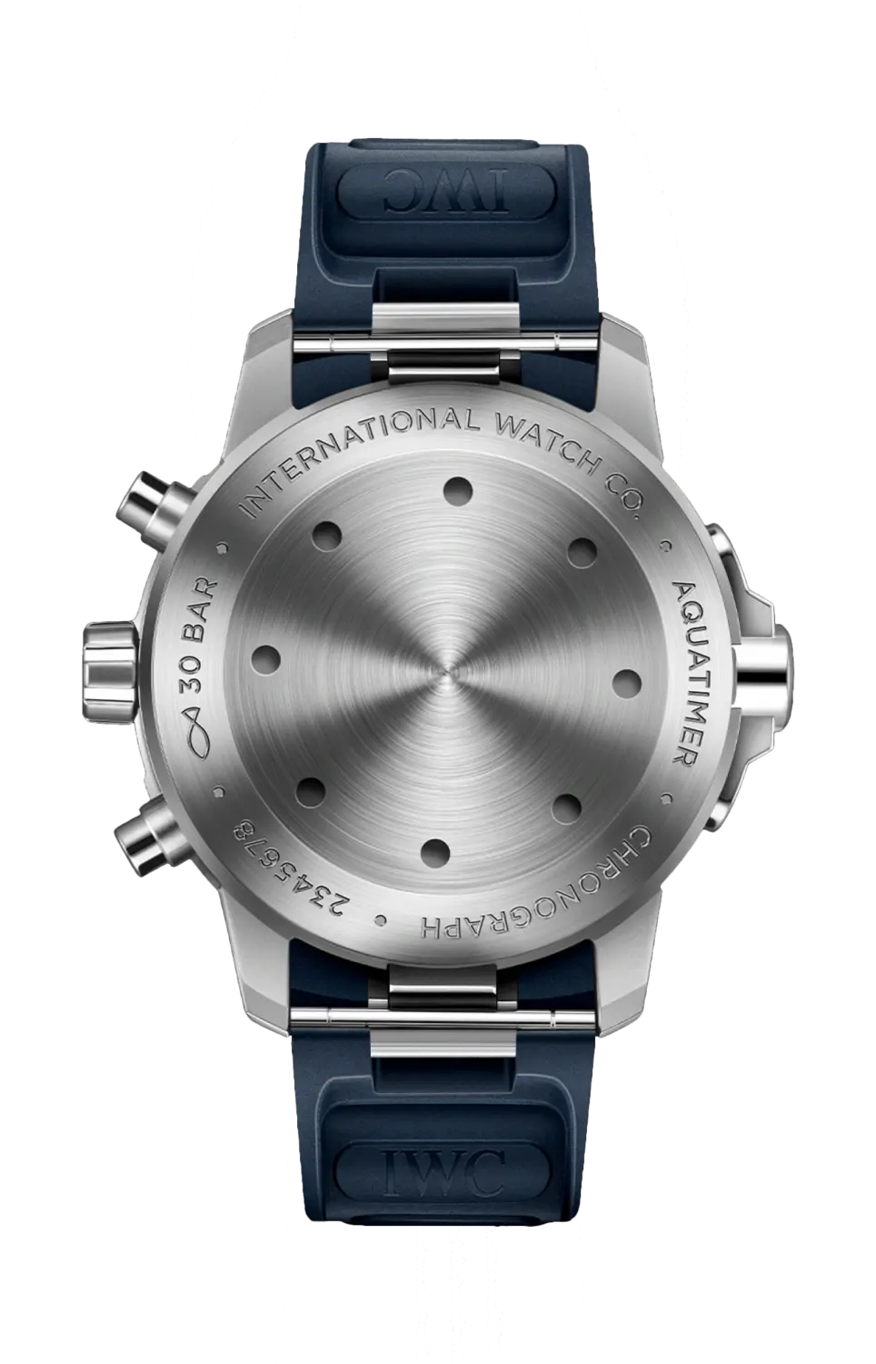 Этот хронограф с акватаймером водонепроницаем до 30 бар, имеет стальной корпус, синий циферблат и синий каучуковый ремешок.