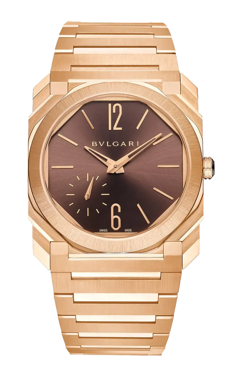 Настоящая икона XXI века, часы Octo Finissimo Automatic воплощают в себе редкое сочетание передового итальянского дизайна и швейцарской техники и оснащены самым тонким в мире автоматическим механизмом – толщиной всего 2,23 мм. Благодаря бескомпромиссной прогрессивной механике и ультрапривлекательному монохромному дизайну из сатинированного розового золота 18 карат с коричневым лаковым циферблатом, часы сочетают в себе инновации с опытом, точность и красоту.