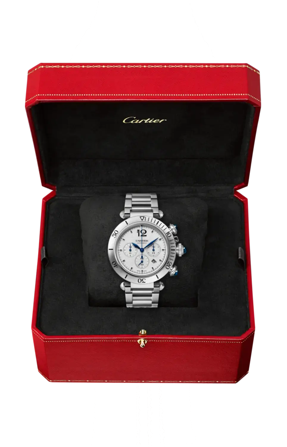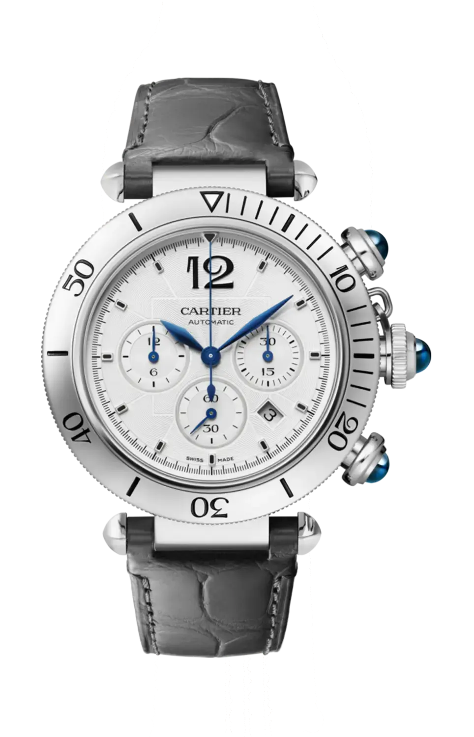 Бренд: Cartier Часы Pasha de Cartier, 41 мм, механический хронограф с автоподзаводом, 1904-ch mc. Стальной корпус, крышка заводной головки, рифленая заводная головка и кнопки, украшенные синтетической шпинелью, посеребренный циферблат, ромбовидные стрелки из вороненой стали, стальной браслет с системой регулировки размера Smartlink, второй темно-серый ремешок из кожи аллигатора, сменная складная пряжка из стали. Оба ремешка оснащены системой смены Quickswitch. Диаметр корпуса 41 мм, толщина 11,97 мм. Водонепроницаемость до 100 метров.