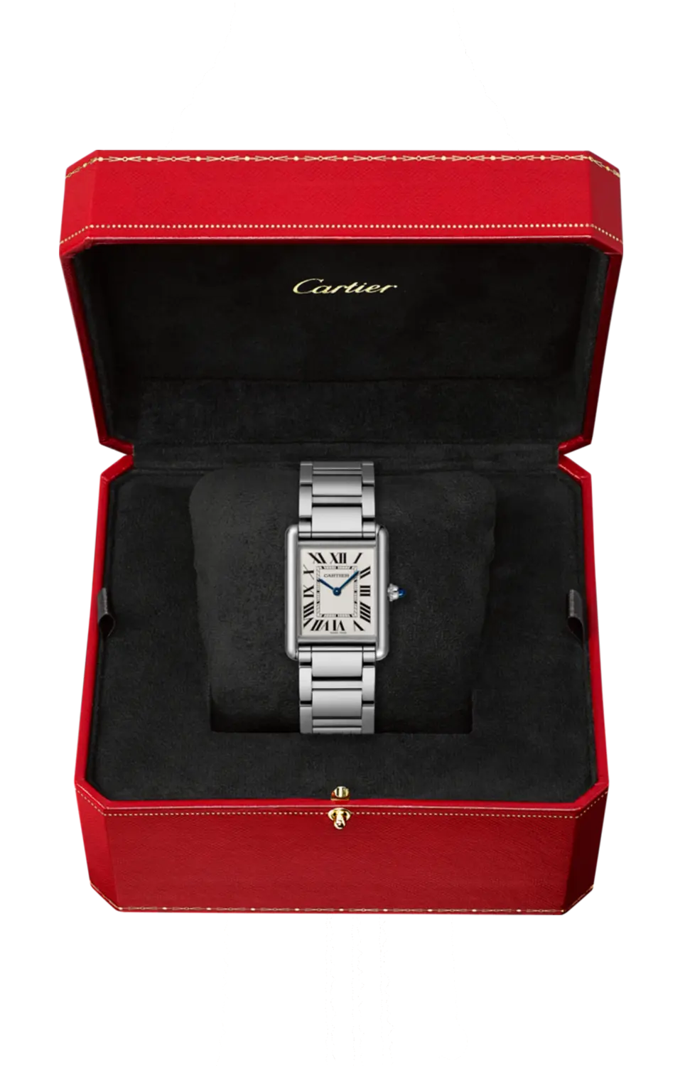 Часы Must Tank, крупная модель, кварцевый механизм. Стальной корпус, перламутровая заводная головка, украшенная кабошоном из синтетической шпинели, серебряный циферблат, стрелки в форме мечей из вороненой стали, стальной браслет. Размеры корпуса 33,7 х 25,5 мм, толщина 6,6 мм. Водонепроницаемость до 30 метров.