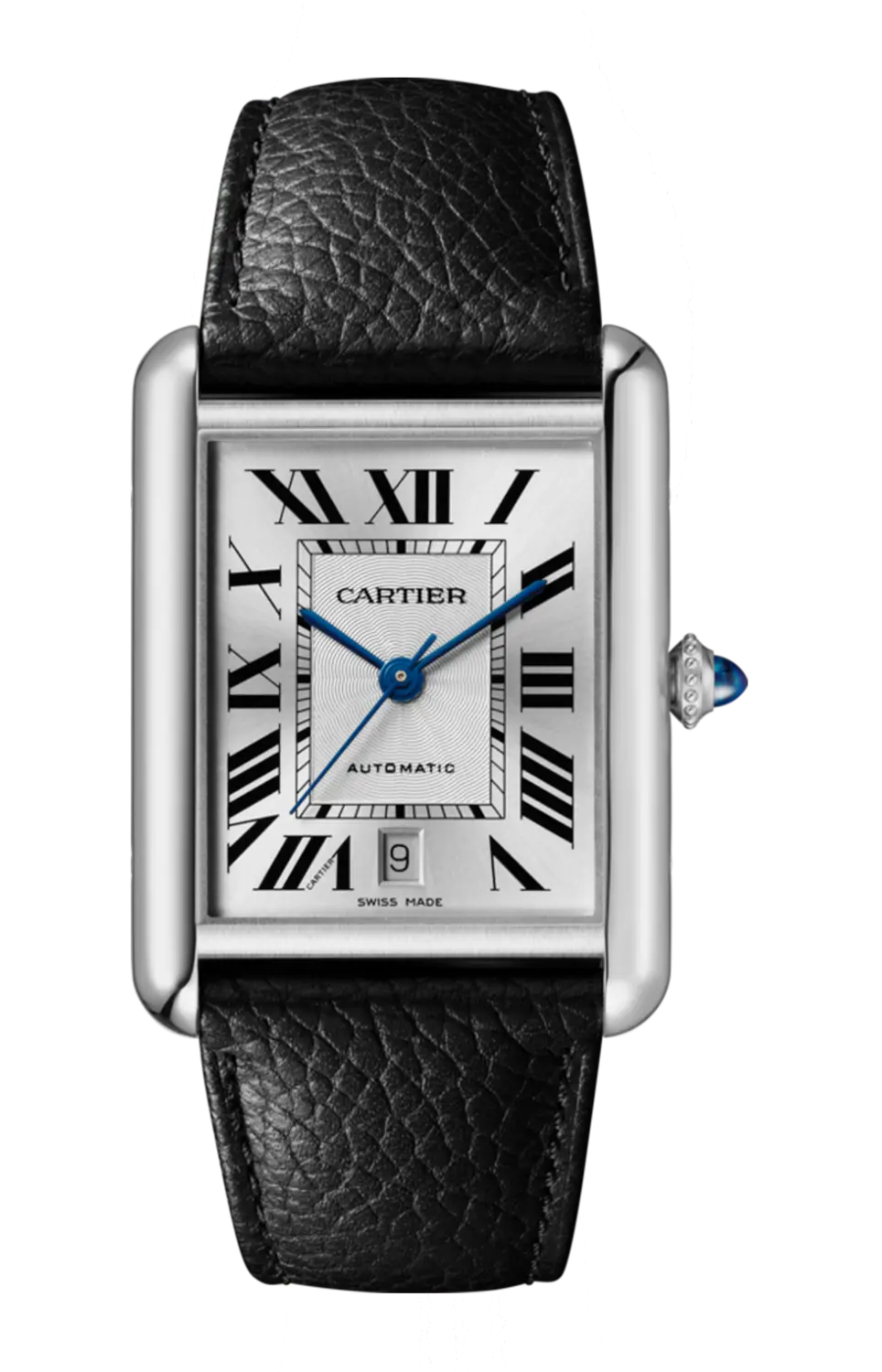 Часы Must Tank, очень большая модель, механизм 1847 MC с автоподзаводом. Стальной корпус, перламутровая заводная головка, украшенная кабошоном из синтетической шпинели, посеребренный циферблат, стрелки в форме мечей из вороненой стали, черный зерненый ремешок из телячьей кожи, сменная стальная раскладывающаяся застежка, окошко даты в положении «6 часов», размер корпуса 41 x 31 мм, толщина 8,4. мм. Водонепроницаемость до 30 метров.