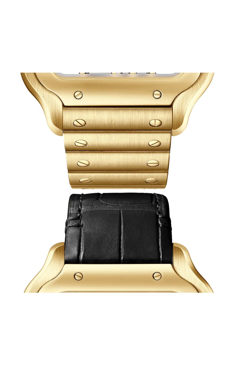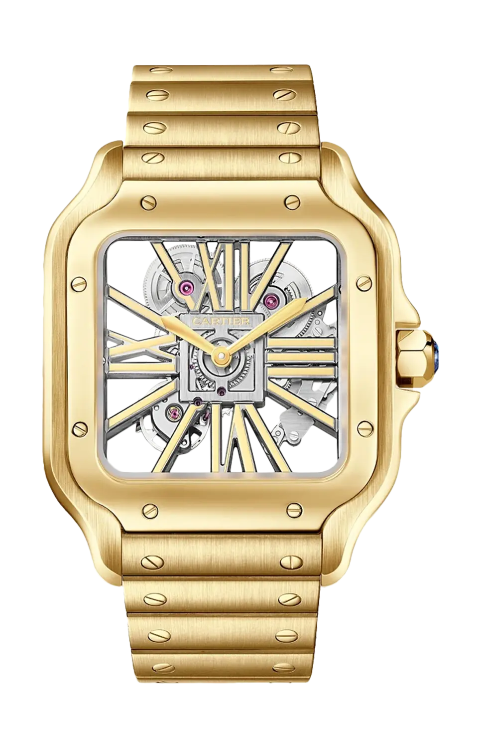 Бренд: Cartier Часы-скелетон Santos de Cartier, крупная модель, скелетонированный механизм с ручным заводом, 9612 mc. Корпус из желтого золота 750/1000 пробы, семиугольная заводная головка с ограненным сапфиром, позолоченные стрелки в форме мечей, сапфировое стекло и задняя крышка. Браслет из желтого золота 750/1000 пробы с системой регулировки размера «smartlink». Второй ремешок из полуматовой кожи аллигатора серого цвета со сменной раскладывающейся застежкой из желтого золота 750/1000 пробы. Браслет и ремешок оснащены системой смены «быстрый переключатель». Часы, минуты со скелетонизированными мостами в форме римских цифр. Механизм состоит из 138 компонентов, в том числе 20 рубинов. Размеры механизма 28 х 28 мм, толщина 3,97 мм, баланс 28 800 полуколебаний/час, запас хода около 72 часов. Ширина корпуса 39,7 мм, толщина 9,08 мм. Водонепроницаемость до 100 метров.