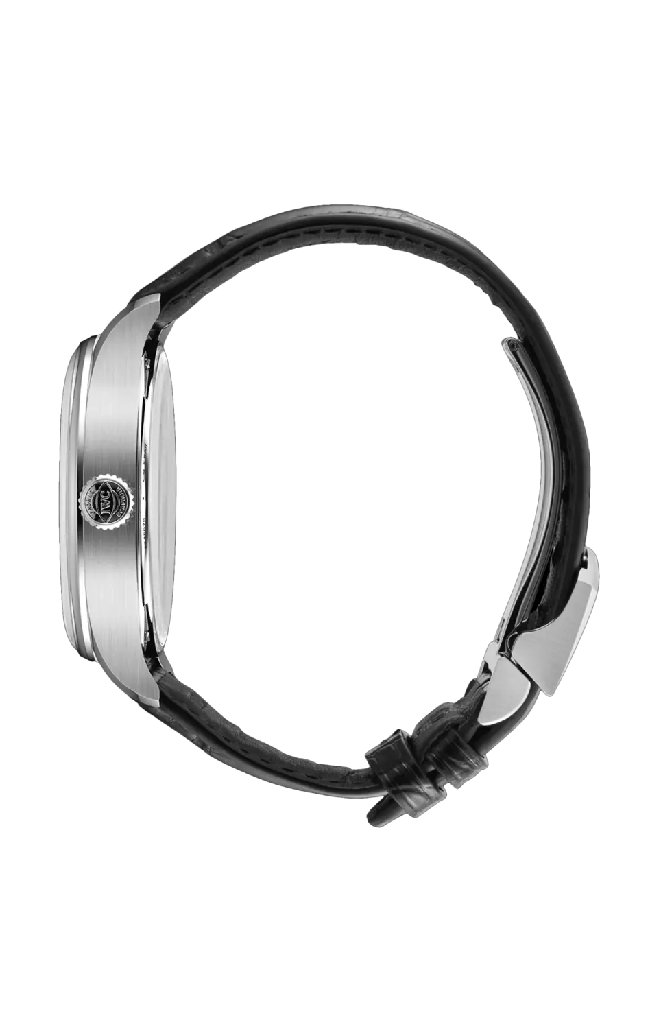 Стальной корпус, автоматический завод, диаметр 42,4 мм, черный ремешок из кожи аллигатора, ширина ремешка 22,0 мм.