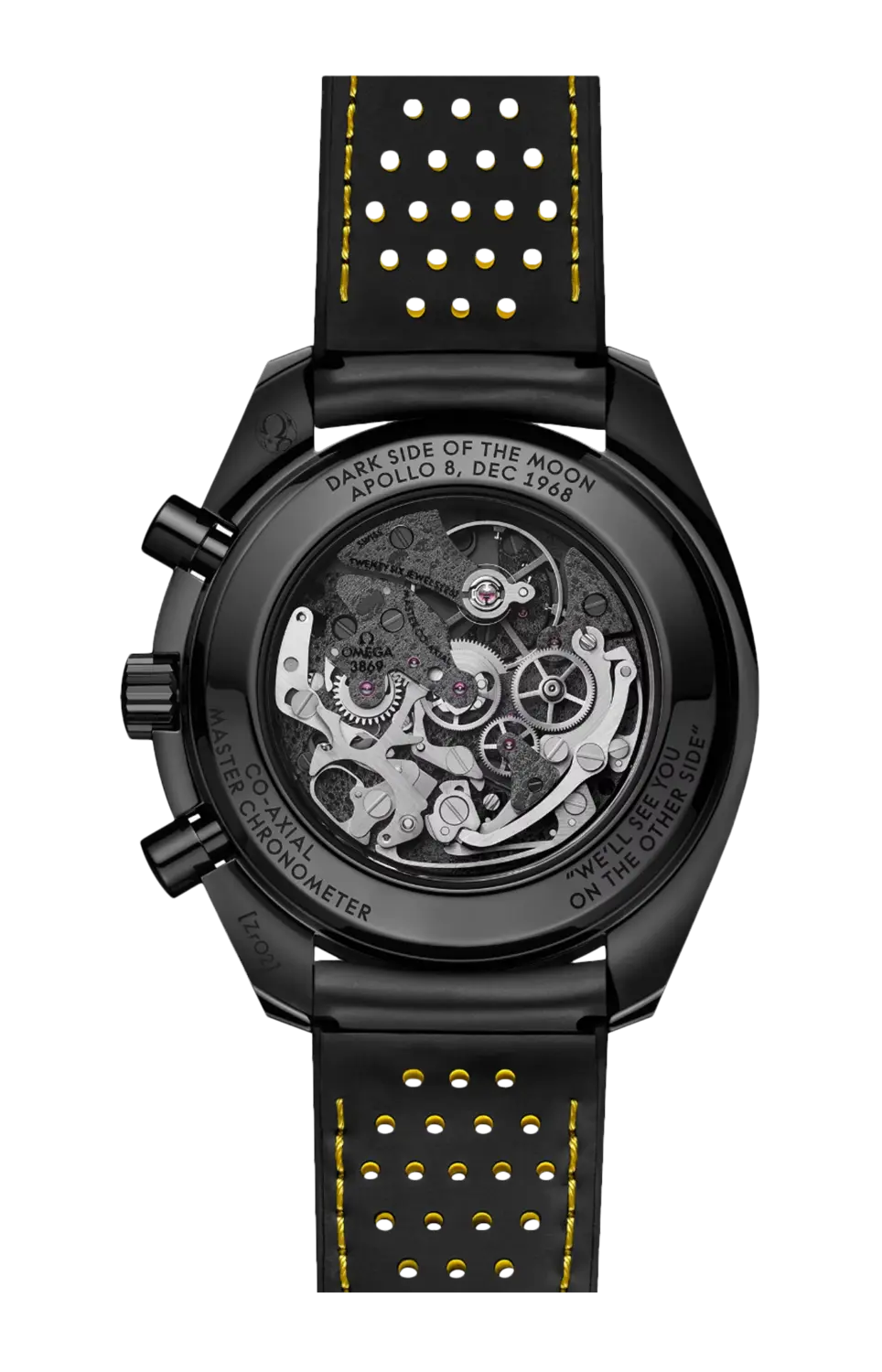 Бренд: Omega Легендарные часы Omega Speedmaster, участвовавшие во всех шести высадках на Луну в истории, являются настоящей иконой космоса, а также идеальным выражением новаторского духа Omega. Эта модель диаметром 44,25 мм прославляет историю часов Speedmaster на борту миссии Аполлона 8 благодаря своей полированной поверхности. движение, созданное лазерной абляцией на основной пластине и мостах, напоминает лунную поверхность. Скелетонизированный циферблат из черного анодированного алюминия позволяет увидеть видимую сторону спутника, а темную сторону можно увидеть через заднюю крышку. Часы полностью изготовлены из черной керамики и дополнены черным кожаным ремешком с желтой резиновой внутренней частью. . Дизайн дополняют окрашенные в желтый цвет секундные стрелки хронографа и тахиметрическая шкала с лазерной гравировкой на безеле из белой эмали. Малый секундный счетчик (в настоящее время проходит регистрацию) также включает в себя стрелку из титана 5-го класса в форме ракеты Сатурн-5. Эта трехмерная форма получена с помощью лазера, а цвета получены с помощью белой эмали, лазерной абляции и полировки. Часы Omega Co-axis Master Chronometer 3869 украшены специальным декором, а на задней крышке выгравированы надписи «Аполлон 8, декабрь 1968 года». », «Темная сторона Луны», «Увидимся на другой стороне» и «Коаксиальный мастер-хронометр».