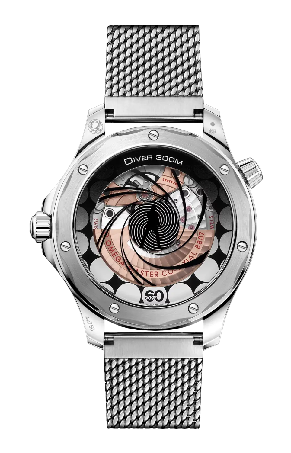 Бренд: Omega Выпущенная в 2022 году в ознаменование 60-летия Джеймса Бонда модель Seamaster Diver 300m диаметром 42 мм в цвете Canopus Gold оснащена циферблатом из натурального серого кремния, отдающим дань уважения пляжам карибского уединения агента 007. Циферблат обрамляет вращающийся в одном направлении безель с паве из бриллиантов. украшены зелеными и желтыми бриллиантами, а также двумя бриллиантами в положении «12 часов». Начало фильма, изображающее силуэт Джеймса Бонда и вращающийся ствол пистолета, изображено на задней крышке из сапфирового стекла с использованием техники микроструктурированной металлизации. Анимация с эффектом «муара» напоминает вращение секундной стрелки «леденца». Часы надежно крепятся на запястье благодаря браслету из миланской сетки с пряжкой из 18-каратного золота Canopus. Бьющееся сердце часов — калибр Omega с осевым мастером. хронометр 8807, усовершенствованная версия калибра 8806, который используется в традиционных моделях Seamaster Diver 300m. Часы представлены в деревянной коробке. дерево манго с инкрустацией из перламутра, логотипом «60 лет связи» и тремя точками — эволюцией формы видоискателя, напоминающей знаменитый вступительный эпизод фильмов об агенте 007. Использование манго. wood — напоминание об эксцентричном фильме «Под манговым деревом», саундтреке к легким эпизодам фильмов, посвященных британскому секретному агенту.